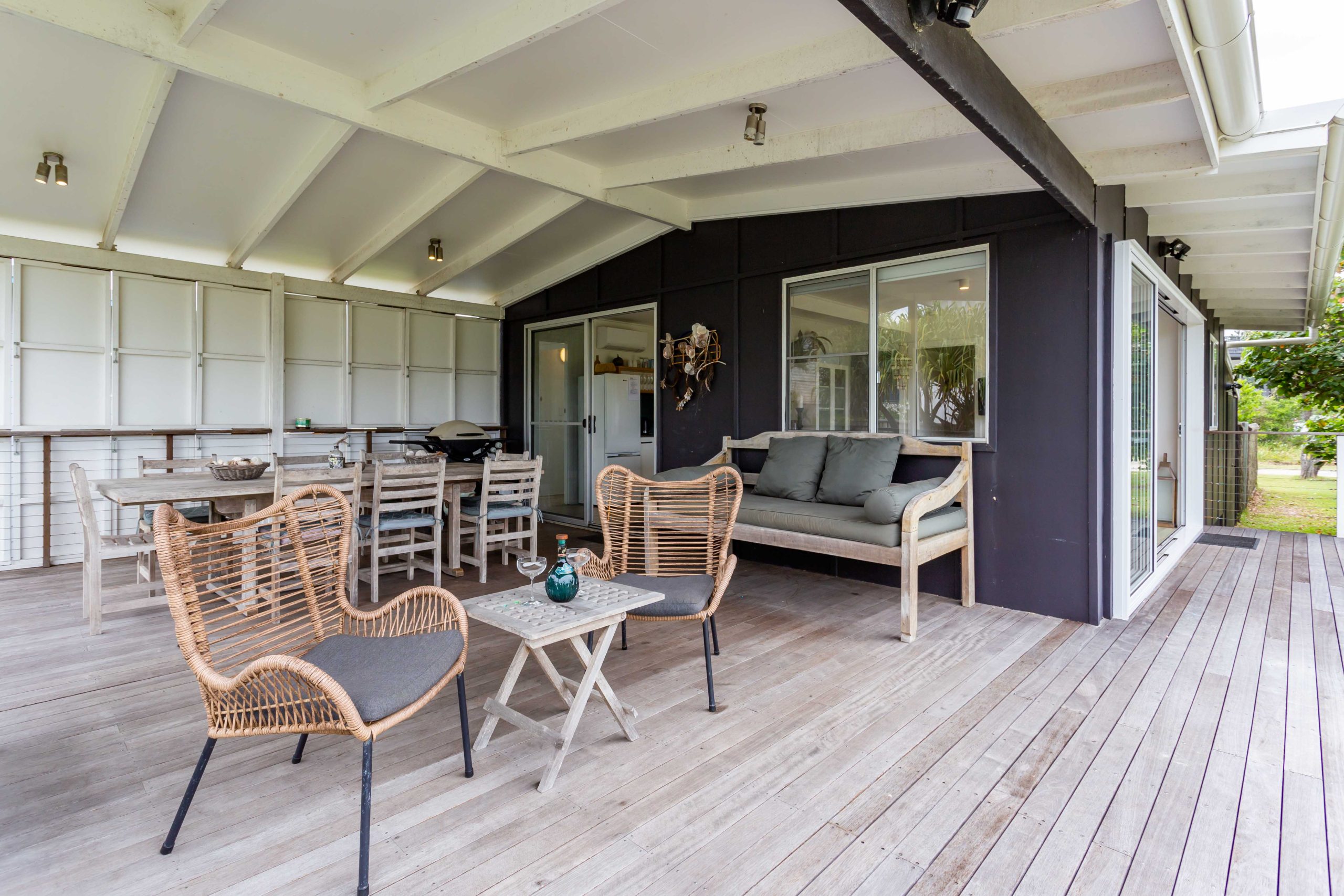 The spacious north-facing deck features an inviting outdoor dining area, comfortable seating, and a daybed, all ideal for unwinding. Beautiful new tiered timber steps grace the entrance, offering a perfect spot to relax after a day on the sand.