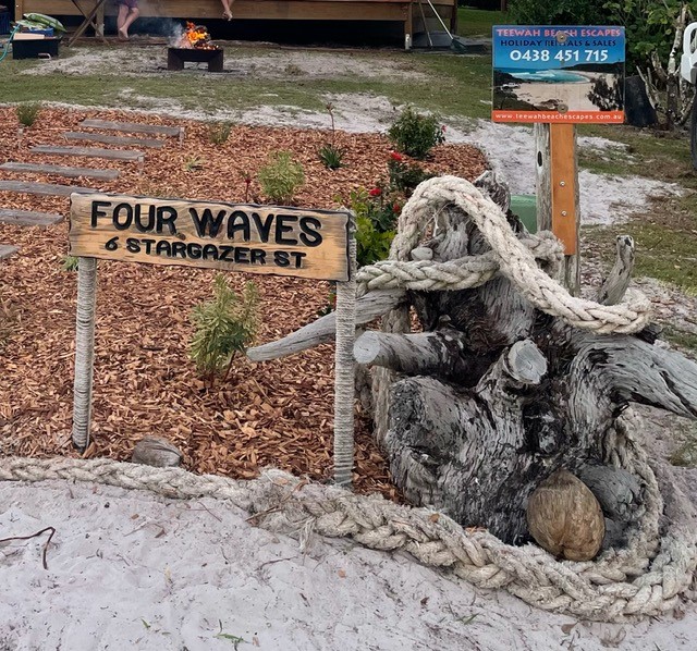 - Once on the beach drive for approx 6kms north, turn into the Teewah Village, drive straight ahead to the "T" section, turn left then turn right into Stargazer Street, the heli pad is on the left and "Four Waves" is the third house on the right the house with "A"frame.