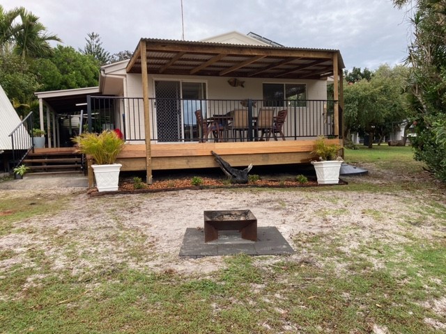 - Amenities: 1 Single trundle + double sofa bed, 2 Bathrooms, 2 Bedroom, 2 Toilets, BBQ, BBQ- gas provided, Fans in bedrooms, fans throughout, Fire Bowl BYO wood, Large Covered Verandah, Laundry with washing machine, Linen is not included but can be hired or BYO sheets,towels and pillow slips, Microwave, NON SMOKING, One bedroom bungalow. Can be added to your booking. Please contact our office as further charges apply., One small pet allowed, Open plan living and kitchen area, Outdoor setting, Tiled through out, TV and DVD player