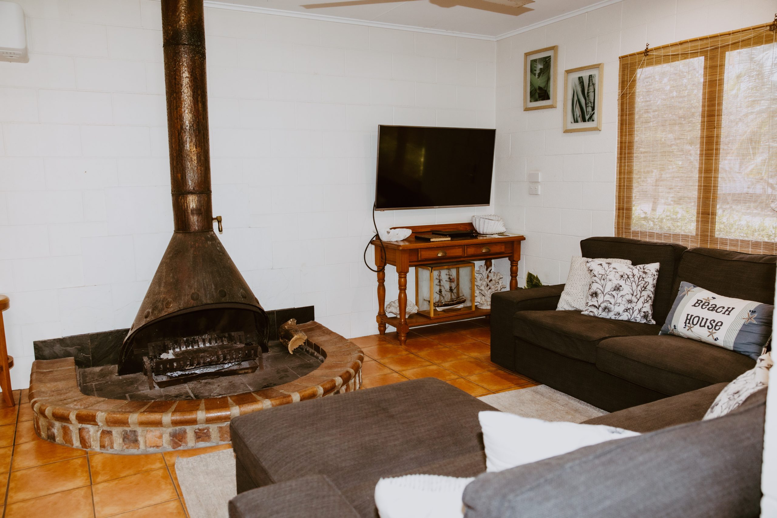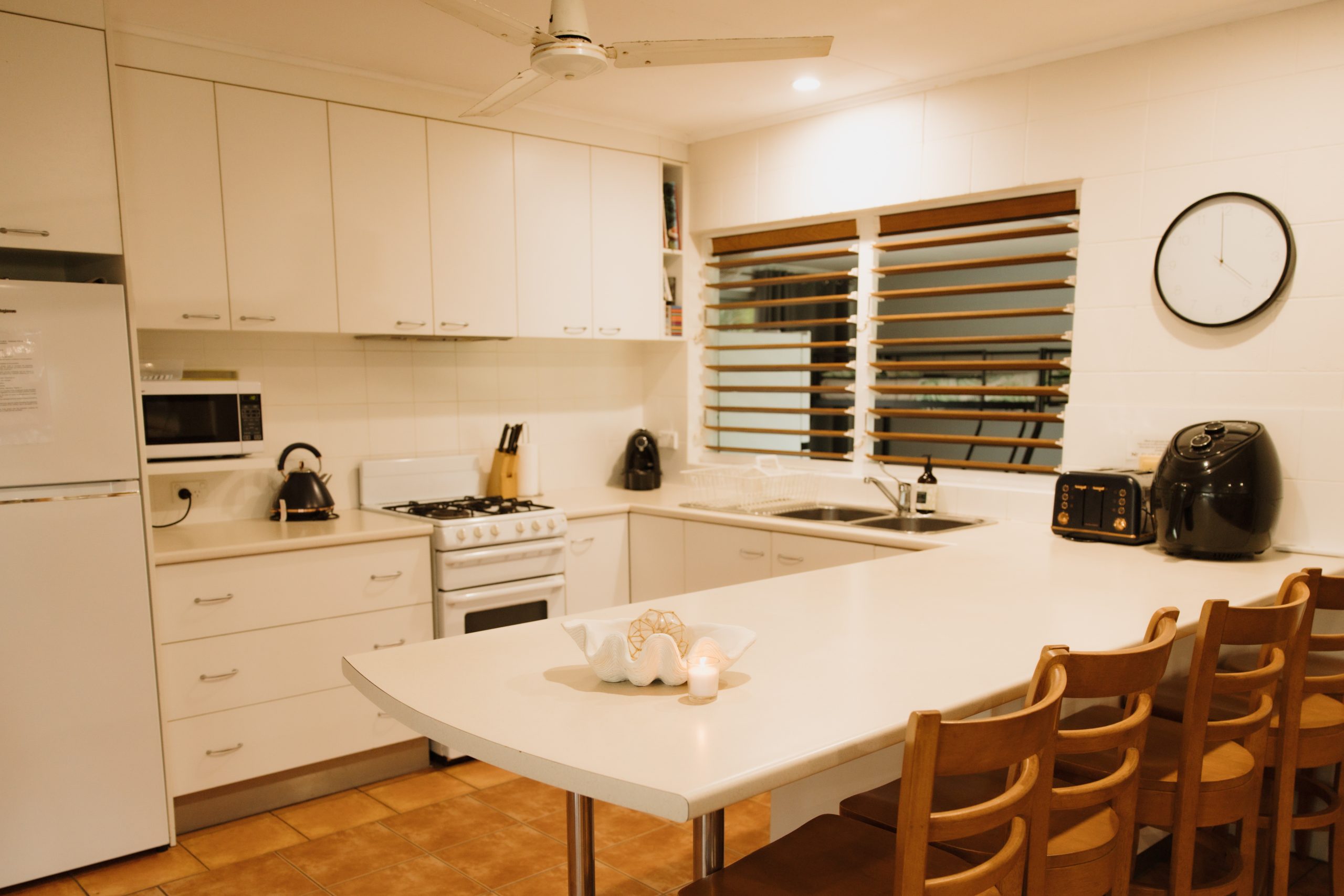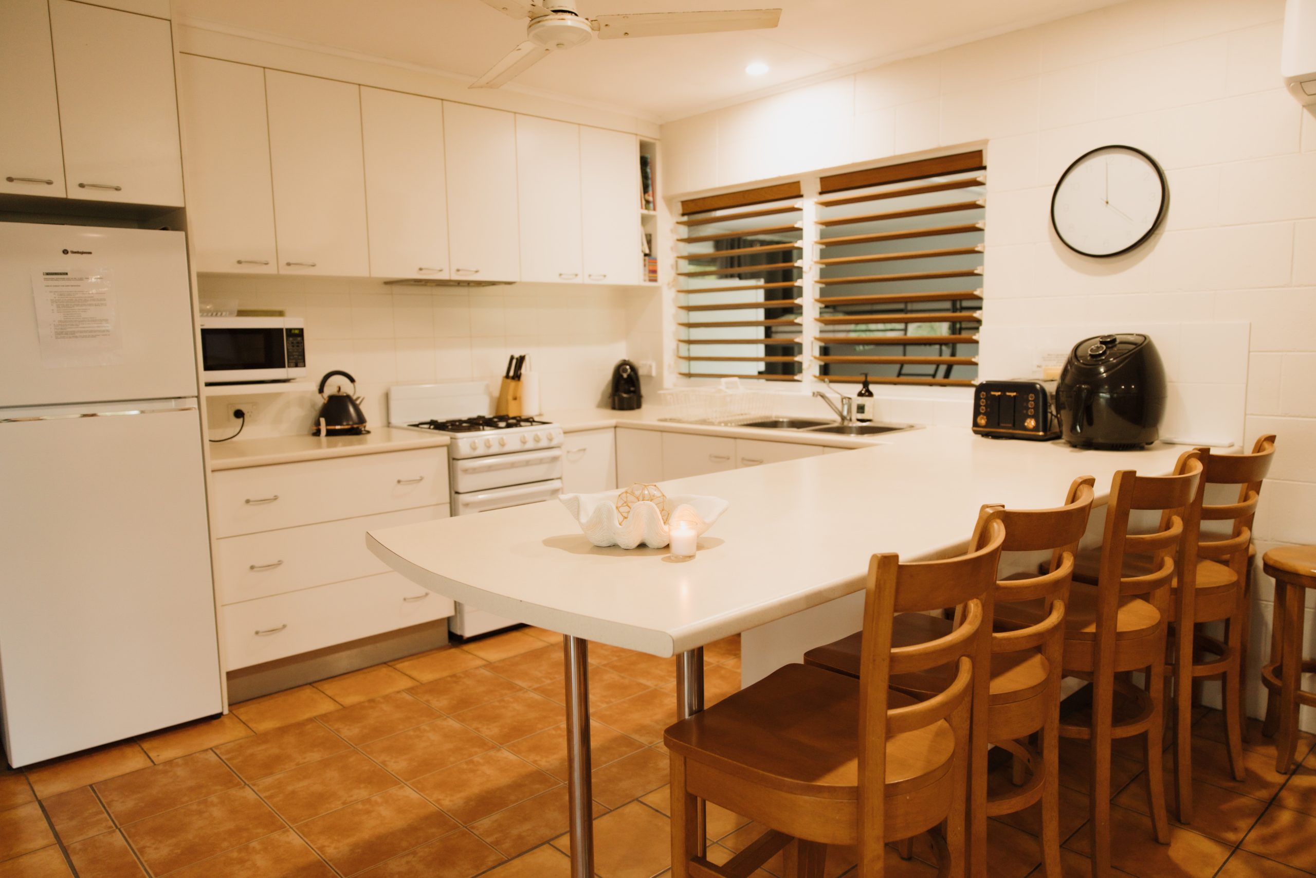 The fully equipped kitchen includes an air fryer, coffee machine, microwave, and two refrigerators, making meal prep a breeze. Ceiling fans are in two bedrooms and the bunk room, and the living area has a reverse cycle air conditioner for year-round comfort.