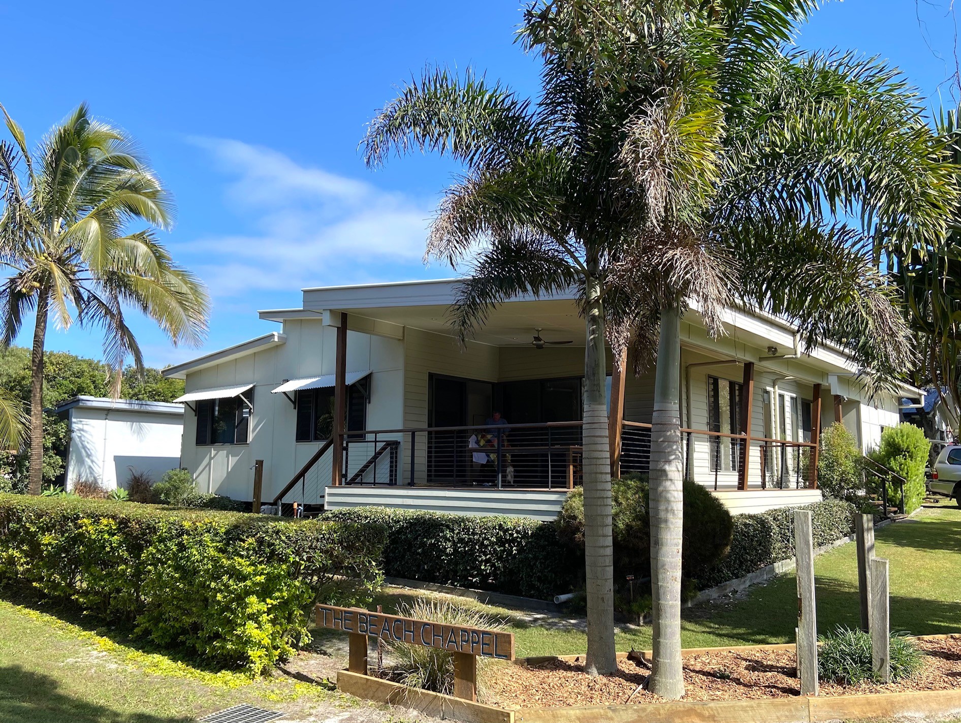 • Once on the beach, turn left (North) for approx 6 kms..turn into the Teewah Village..drive straight ahead to the T road..turn right into Mackerel Street.. then turn left into Swallowtail Street..take the first driveway on your left..The Beach Chappel